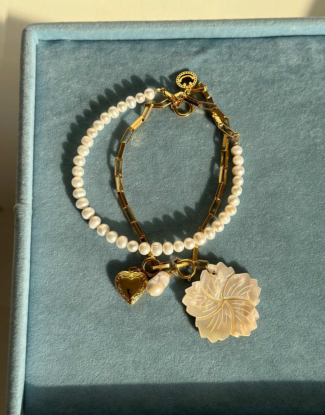 Jewelry that is not solid gold or gold filled should never be worn in the shower, pool or ocean.